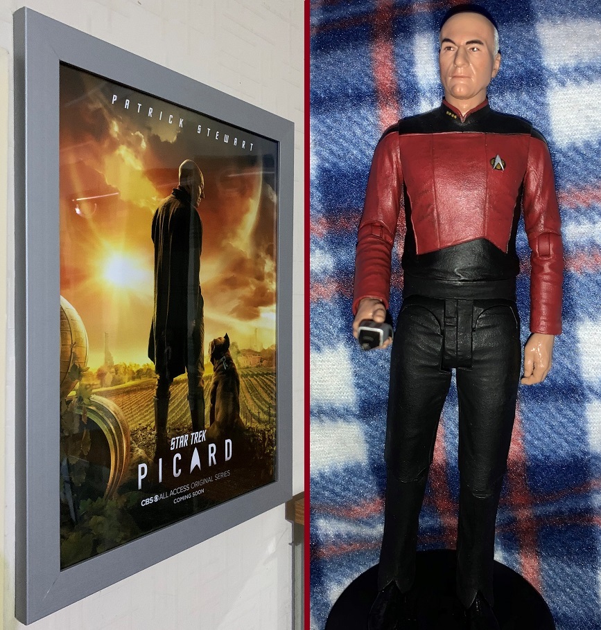 I don’t wear t-shirts very often. That’s just a personal style preference, I guess. But as I waited for Amazon Prime Video to make Star Trek: Picard’s premiere episode available here in the UK, I was wearing my Star Trek: Picard t-shirt which I’d managed to get a few days ago. As I watched the clock tick awfully slowly to the moment I expected the episode to go live, both of the promotional posters for Picard – the vineyard Starfleet logo and the one with Picard and his dog – were hanging framed on my wall. And my Jean-Luc Picard action figure stood proudly in my glass display cabinet. Suffice to say, I’m a fan.