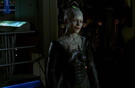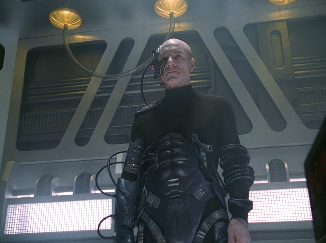 The addition of the Borg Queen is symptomatic of this. After several prior Borg stories, and with their first big-screen appearance looming, there must have been some discussion about how to make the Borg intimidating again. It wasn’t enough to have this faceless mass any more, the Borg needed something new in order to fit the bill as big-screen villains. Part of that stems from the need to keep the story cinematic; to have those moments where Picard is traumatised by his memories of the Borg Queen, to have Data tempted and taunted by her in a way a nameless drone couldn’t, and to be able to have dialogue between heroes and villains which is often a tense yet satisfying part of storytelling in and of itself. But a significant part of the Borg Queen’s role in First Contact and subsequently has been to rejuvenate the Borg as a faction from a storytelling perspective.