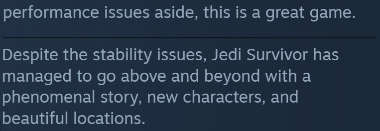 One of the disappointing trends that I’ve seen, not just with PC games in 2023 but with a whole host of “release now, fix later” titles, is players and fans covering for and continuing to support these faceless, greedy corporations. Too many people seem willing to make excuses on behalf of big publishers, essentially doing the job of a marketing team for the. Some games, like Jedi: Survivor, have even received positive reviews on platforms like Steam and Metacritic, even as the reviewer admits that the game is in a poor state and playing it isn’t a great experience. Why say that? What benefit is there?