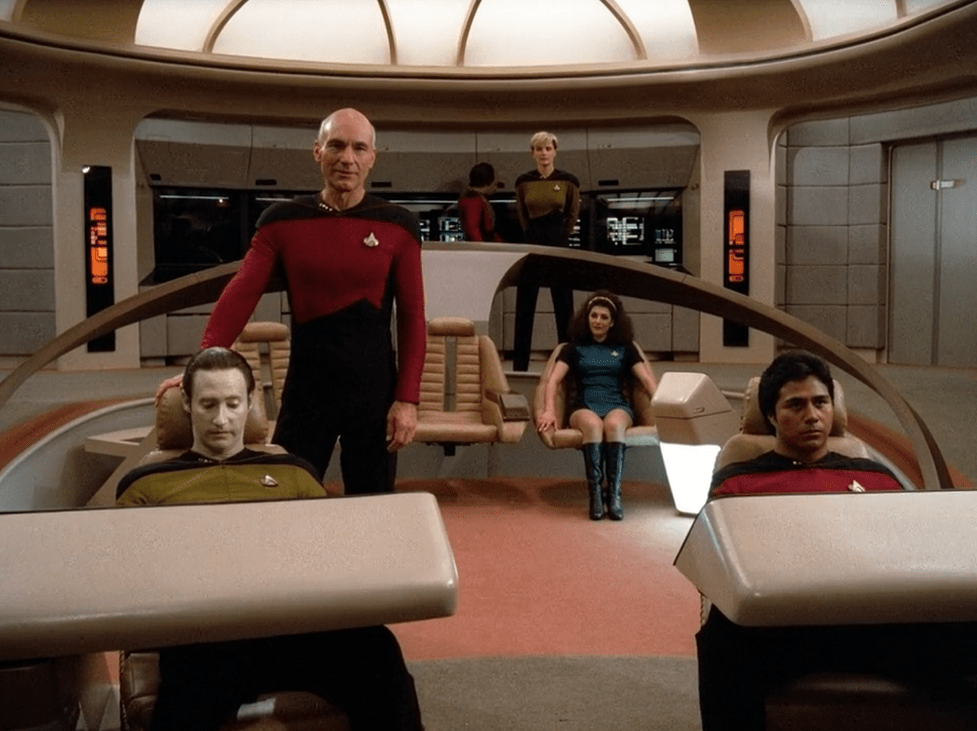 Picard’s first on-screen appearance on the bridge of the Enterprise-D in Encounter at Farpoint.