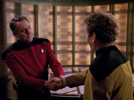 In terms of the structure of the episode itself, I think I’d open with a short teaser in which Captain Pike, Spock, and perhaps other members of the bridge crew are preparing for the arrival of an ambassador. They’d be wearing their finest dress uniforms as the shuttle arrives, and there’d be an “honour guard” similar to the one seen in Journey to Babel. When T’Pol is seen for the first time, that’s when the opening titles would kick in. The next sequence would see Pike assign Spock as T’Pol’s aide while she’s aboard the ship, leading to some scenes between them in which we’d get the aforementioned bonding while en route to Cardassian space.