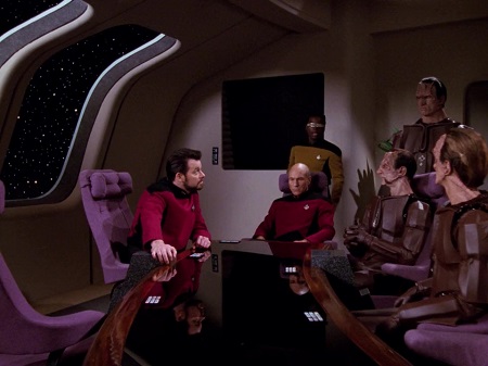 The interior of the Cardassian ship will probably have to be just one room to keep the budget down, but with the AR wall I’d hope it could be a decently-sized space with a table for the two delegations to sit at. In keeping with the design philosophy we discussed above, there should be enough familiar elements to be recognisably Cardassian but without being a carbon copy of something from Deep Space Nine. I’m thinking of a familiar Cardassian computer display, perhaps doorway arches that are reminiscent of those aboard DS9, and similar lighting and colour schemes.