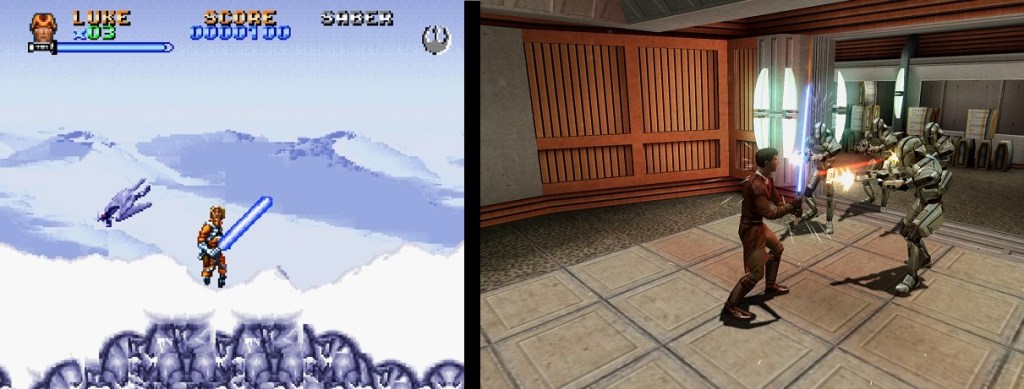 Super Star Wars: The Empire Strikes Back (1993) and Star Wars: Knights of the Old Republic (2003). The games were released a decade apart, and the difference between them is massive.