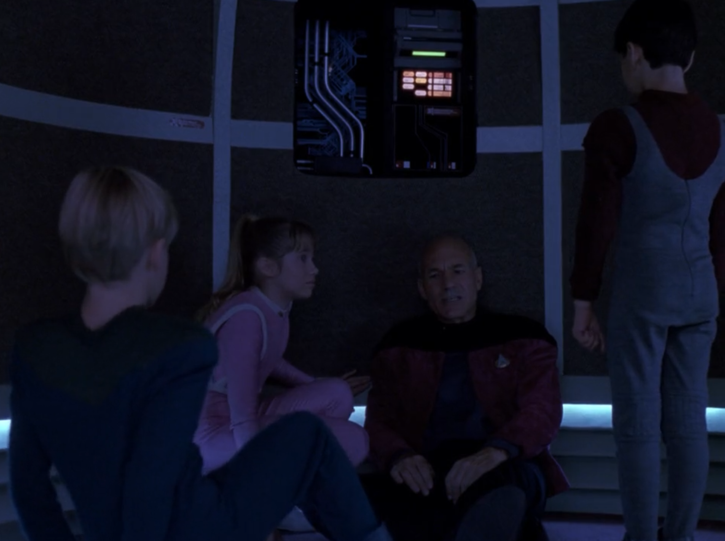 It’s a great example of characters working in the face of adversity, and of how the threat and danger in an episode of Star Trek doesn’t have to come from a menacing evil alien. Worf ends up delivering a baby, Counsellor Troi is the senior officer on the bridge and is forced to make significant command decisions, and most significantly for our purposes, Picard is stuck in a turbolift with a group of frightened children.