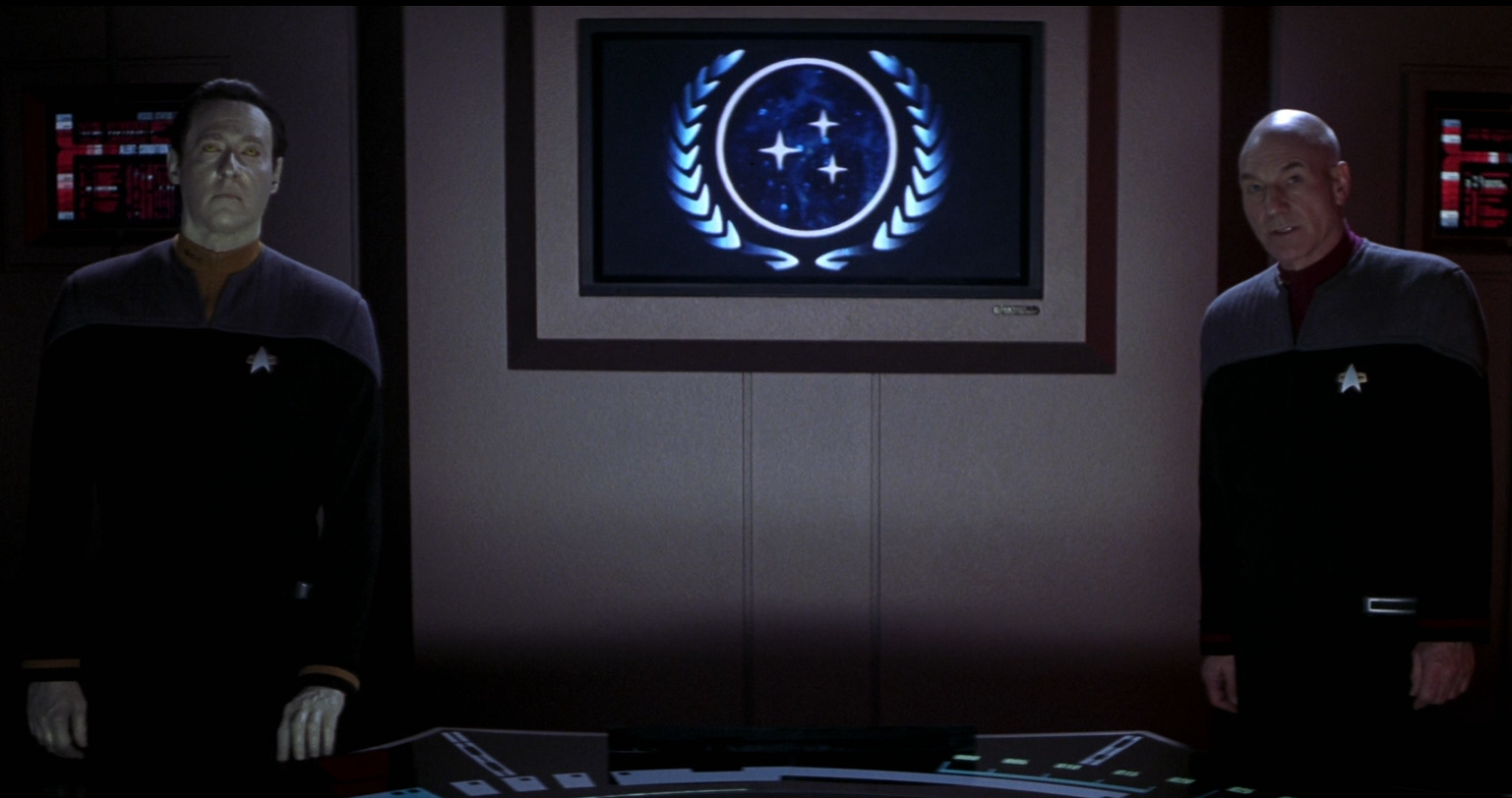 Maddox makes his case to Picard – as well as to Riker and Data – in the briefing room of the Enterprise-D.