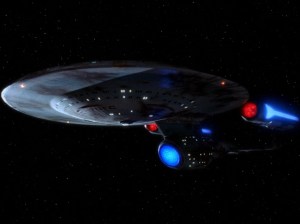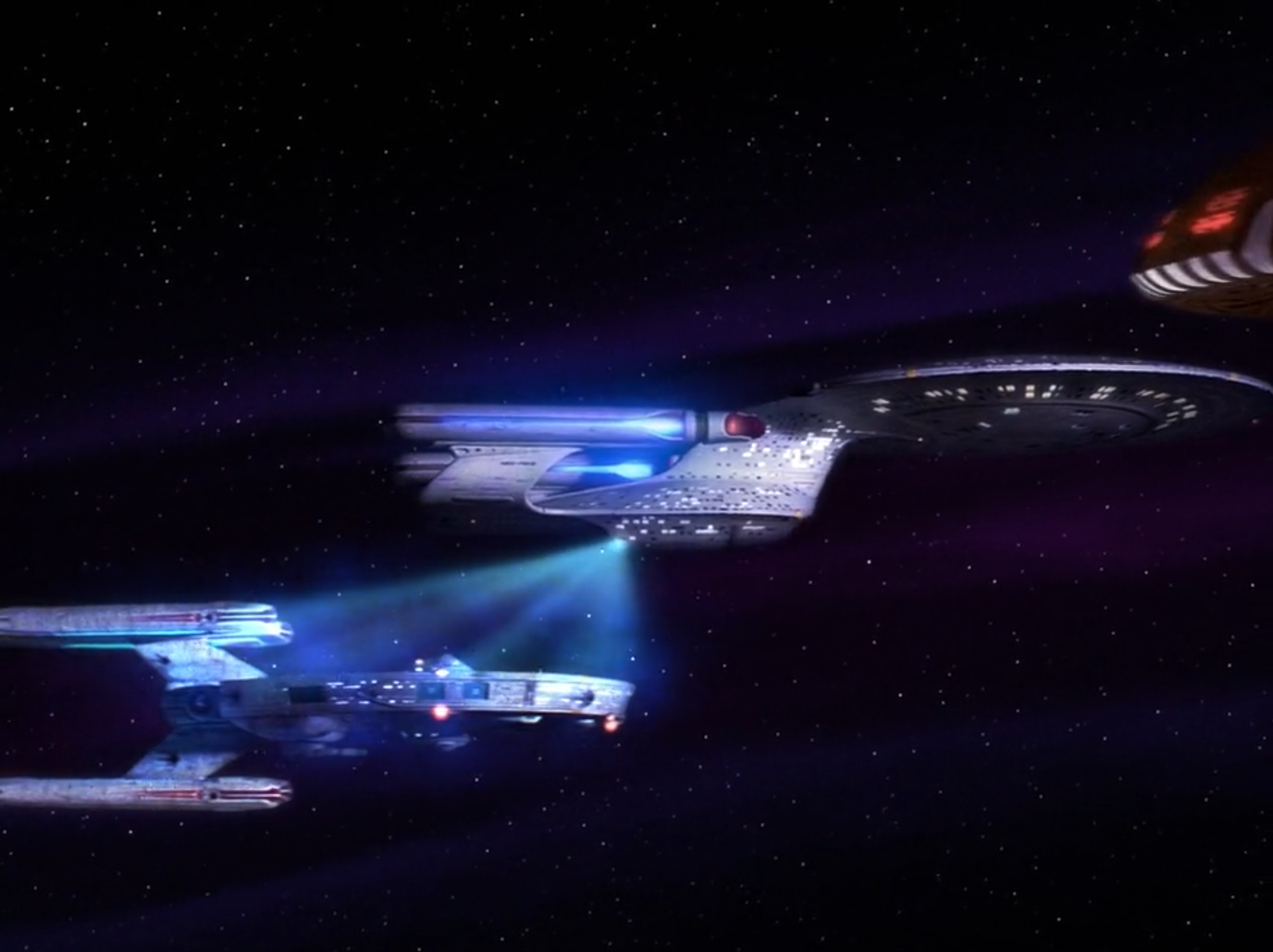 Accompanied by a Ferengi Marauder, the Enterprise-D takes the USS Stargazer under tow in The Battle.