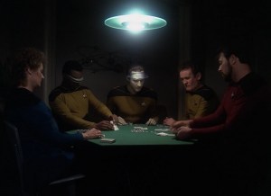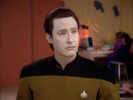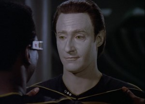 Back aboard the Enterprise-D, Data is packing his belongings, and pauses briefly over a hologram of Tasha Yar. Maddox enters the room while Data has his back turned, and picks up a book that Data had been reading. Barging in without ringing the door chime is another way Maddox demonstrates to the audience that he doesn’t regard Data as warranting the same rights or respect as a human or other life-form. He tries to reassure Data that his knowledge and memories will remain intact despite the procedure, but Data retorts that the facts may remain, but the feelings associated with them will be lost. He then uses the example of the poker game from earlier in the episode – that the moment-to-moment reality, the essence of his experiences, is not just a case of data and facts. Maddox, Data claims, does not have the necessary expertise to preserve Data’s memories and personality.