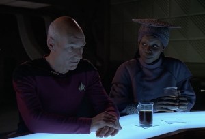 This moment changes the way Picard approaches the case. The word “property”, he believes, is merely a euphemism for slavery. And he returns to work with a renewed sense of purpose. Again, given his state of mind in the first three episodes of Star Trek: Picard, I’d direct anyone who says that Picard “would never get depressed” to look to this moment and others from The Next Generation to see how he can become defeatist and sit in self-pity. It took Guinan here to give him the kick he needed, just as it took Dahj to snap him out of how he’d been feeling in Remembrance.