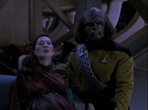 DS9′s executive producer, Ira Steven Behr, has suggested that Resurrection’s place in the season – coming after the intense opening phase of the Dominion War, Starfleet’s recapturing of the station, and then Worf and Dax’s wedding – contributed to fan dissatisfaction, feeling that “nothing” the show had done immediately after those intense stories would’ve been satisfying. I’m not convinced on that, I’m afraid. Season 6 has some of my favourite DS9 episodes. The likes of Who Mourns for Morn, The Magnificent Ferengi, and One Little Ship are all standalone stories that, had they taken this broadcast slot, wouldn’t have been as poorly-received as this uninspired Mirror Universe story.