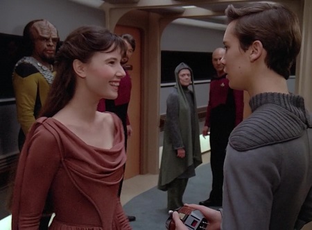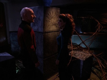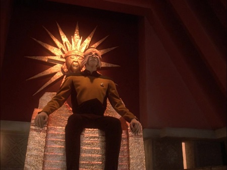 Angel One might be best-remembered among Trekkies for some of its costumes! The costumes worn by the male inhabitants of Angel I, as well as by Riker later during the away mission, were typical Season 1 silliness, reminiscent of some of the costumes created twenty years earlier for TOS. And that’s Angel One in a nutshell, really – it’s one of several Season 1 episodes that plays out like an Original Series story.
