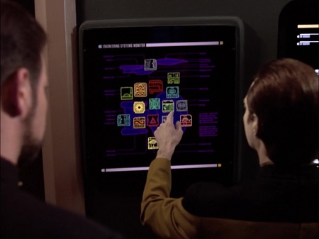 Data again visits Picard in his ready room, and Picard explains the ruling and the challenge he’s making to it. He offers Data the opportunity to select another officer to provide his defence, but Data declines – an important moment given the earlier conversation they had in the same room. We then see Riker studying the law in preparation for the case, feeling pretty rotten about what he has to do. He looks up Data’s technical schematics, smiling to himself as he thinks he’s found something – then his mood and the background music turn sour as he realises the implications. Riker doesn’t want, after all, to win the case. And getting caught up in it for a moment and allowing himself to feel excitement at a breakthrough ends up making him feel worse about the task.